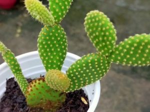 - Cây Xương Rồng tai thỏ có hình ovan, thân cây có màu xanh. Khi cây phát triển có 1 thân chính và mọc 2 nhánh như tai thỏ. Hoặc cũng có nhiều trường hợp cây chỉ mọc 1 nhánh hoặc không mọc nhánh